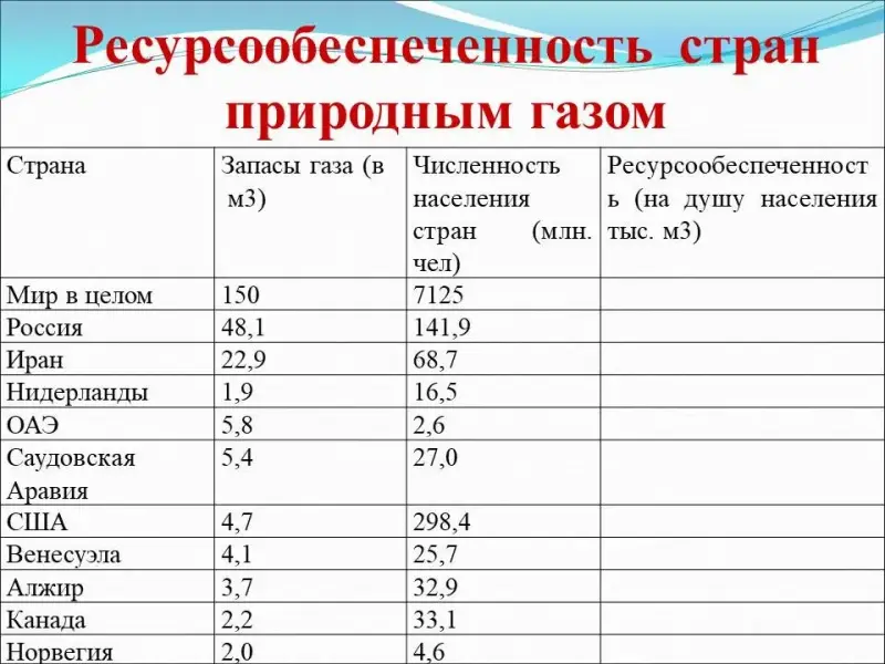- Какие страны имеют наибольшую обеспеченность природным газом на душу населения?