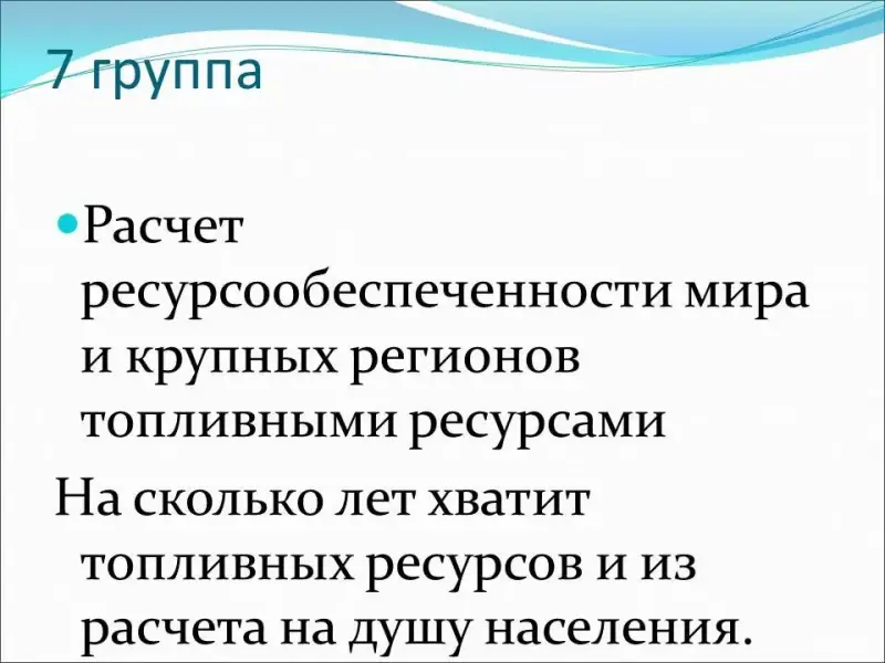 - 7 группа: Расчет ресурсообеспеченности мира и крупных регионов минеральными топливными природными ресурсами, на сколько лет хватит минеральных топливных ресурсов и из расчета на душу населения Мира.