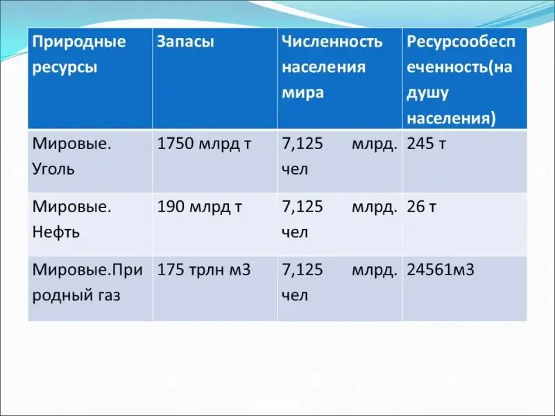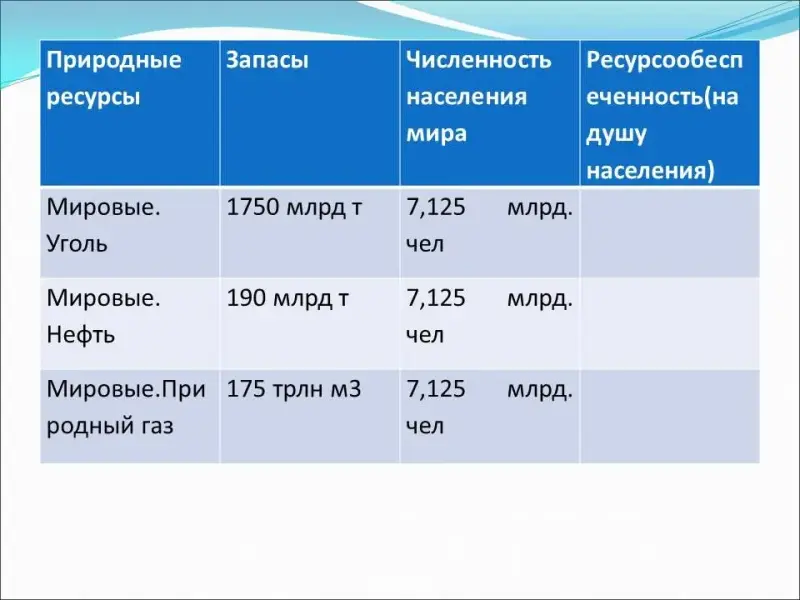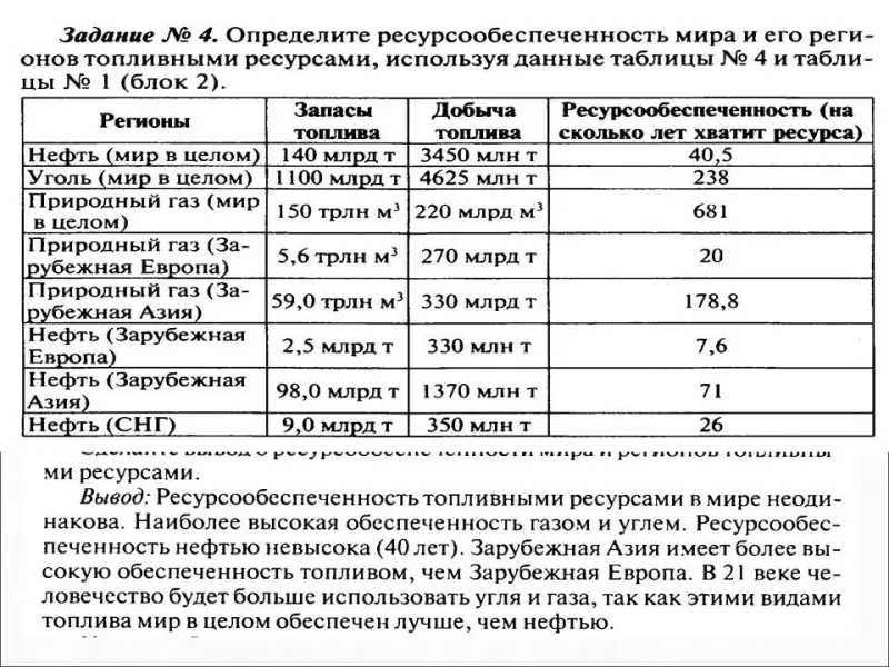 Задание № 1 Определите ресурсообеспеченность крупных регионов и топливными ресурсами из расчета на сколько лет хватит и из расчета на душу населения в мире.