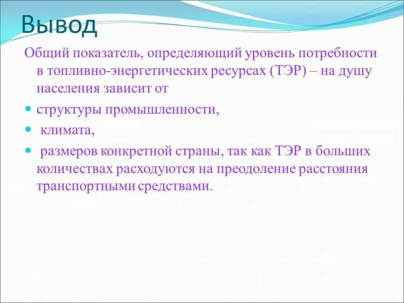 - Общий показатель, определяющий уровень потребности в топливно-энергетических ресурсах (ТЭР) - на душу населения зависит от;