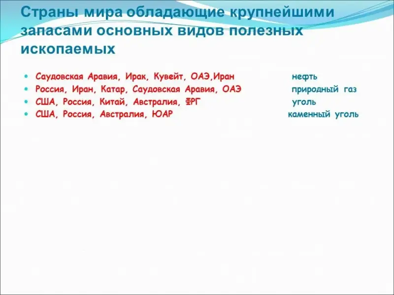 - Далеко не одинаковы запасы отдельных видов природных ресурсов в разных странах мира. Лишь несколько государств обладают достаточными топливно -энергетическими природными ресурсами, среди них - Россия, США, Китай, страны персидского залива.