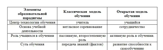 Сегодня, в условиях формирования, развития информационно-образовательной среды и перехода от классической модели обучения к открытой, учитель вынужден по-новому, на основе взаимодействия и сотрудничества выстраивать педагогическое общение. Сравнение моделей обучения образовательных парадигм представлено на Рисунке 1.