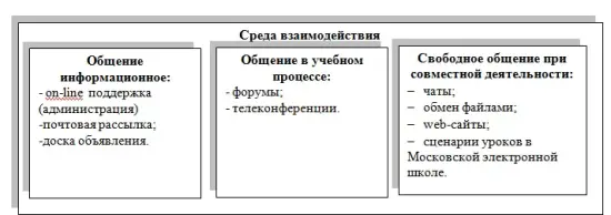 Во всех школах г.Москвы внедрен проект МЭШ - Московская электронная школа. Это интернет-платформа, которая автоматизирует большинство организационных, методических и педагогических задач современной школы. Для реализации проекта создана инфраструктура - это Wi-Fi-точки доступа с высокоскоростным интернетом, школьные серверы, управляемые прикосновением интерактивные панели со встроенным компьютером, ноутбуки учителей и др. Проект состоит из сервисов: электронный журнал и дневник, Библиотека электронных материалов. Возможности данного проекта расширяют общение при совместной учебной деятельности при обмене файлами при назначении домашнего задания, просмотре сценариев урока. Однако, он не поддерживает такие средства информационно-коммуникационных технологий как форумы, телеконференции, почтовая рассылка или доска объявлений. Это говорит о том, что в настоящий момент проект МЭШ не является интегрированным продуктом, имеющим средства организации общения.