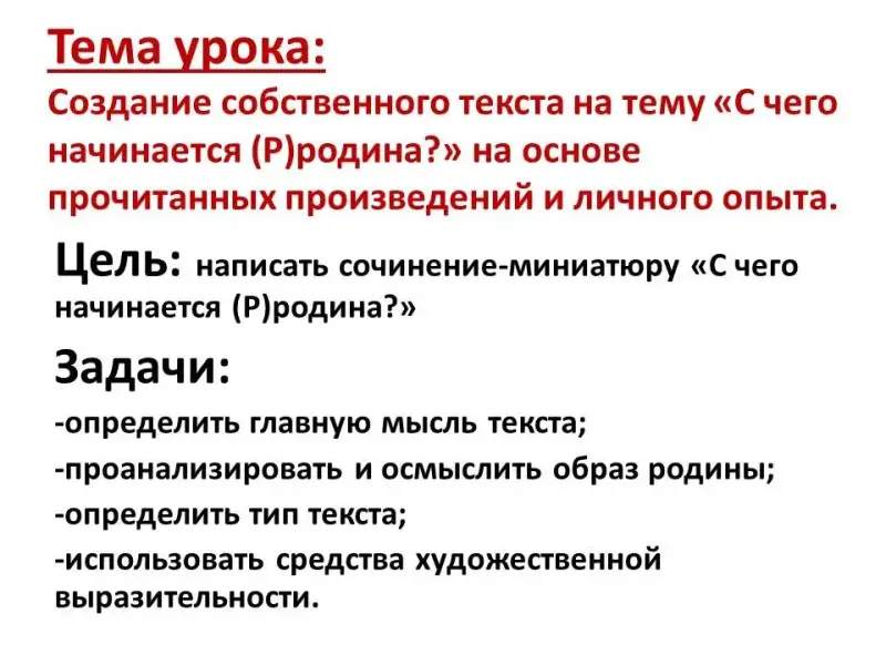 Тема урока: Создание собственного текста на тему «С чего начинается (Р)родина?» на основе прочитанных произведений и личного опыта.