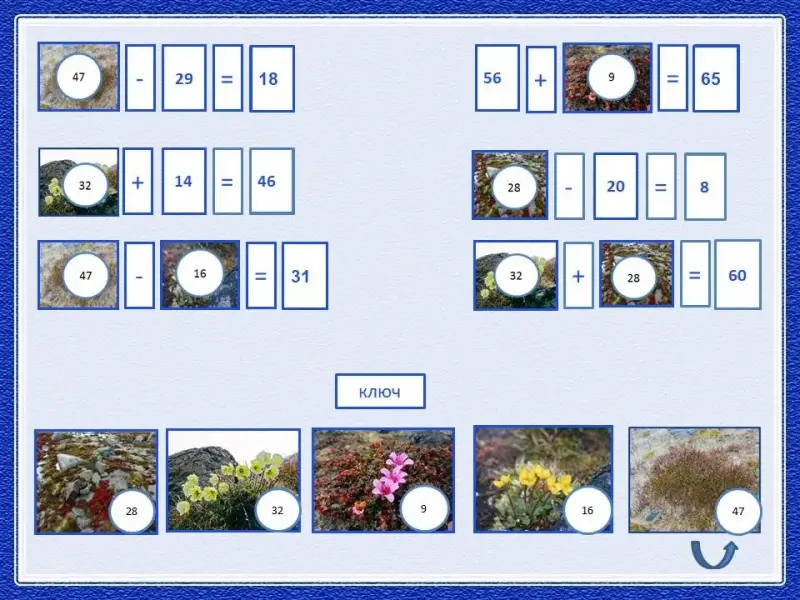 - выполнять сложение и вычитание чисел в пределах 100, используя ключ к заданию;