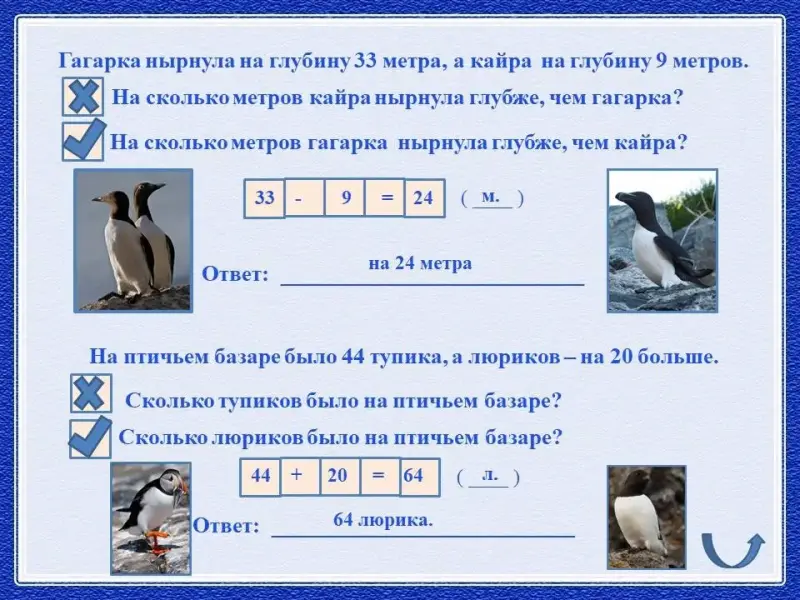 Учитель нажимает на фотографии кайры, гагарки, тупика, люрика.