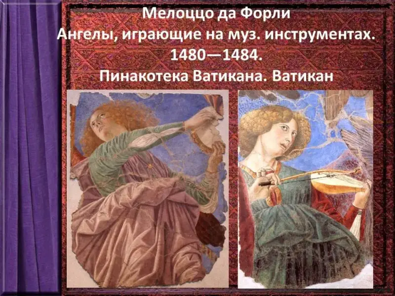 Итальянский художник Мелоццо да Форли в середине XV века работал в Риме, где расписывал библиотеку Ватикана. Эти фрески принесли ему славу и поражают своим иллюзорным эффектом влетающих в окна ангелов и играющих на музыкальных инструментах. Поворот головы, взгляд, пальцы, перебирающие струны - каждая деталь его фресок наполнена жизнью.