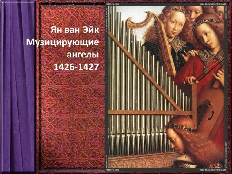 Не менее выразительны поющие ангелы на одной из створок Гентского алтаря. Хористы поют сосредоточенно, напряженно, с характерной мимикой. Прекрасными их делает не совершенство черт, а отблеск вдохновения на лицах.