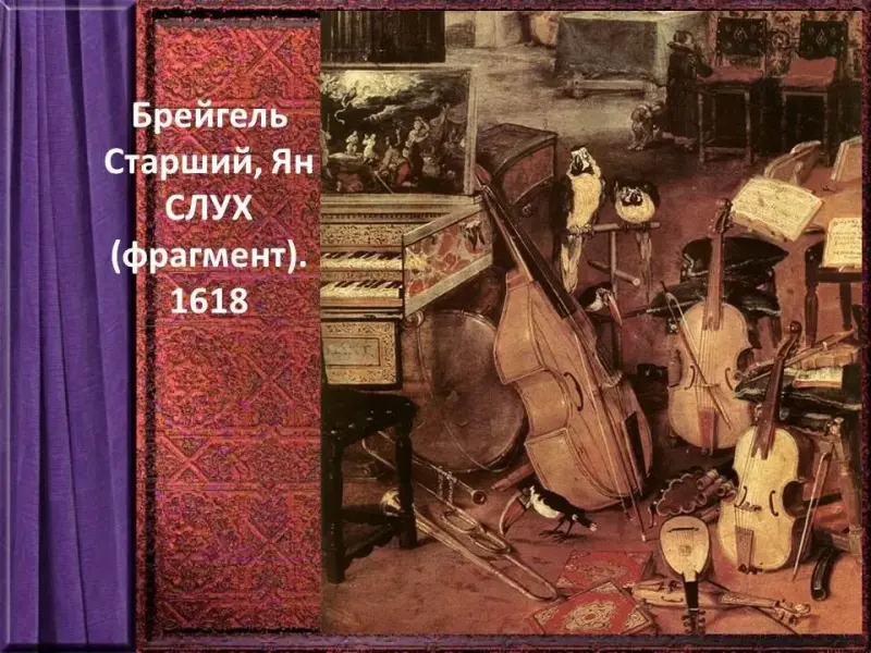 Интересны изображения музыкальных инструментов на полотне нидерландского живописца Яна Брейгеля Старшего «Слух».