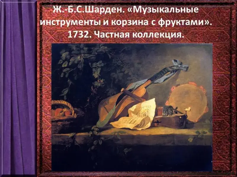 Параллельно с барокко развивался другой стиль - Классицизм, сдержанный, тяготеющий к спокойствию и четкости. Натюрморт выдающегося представителя эпохи Просвещения Жана Батиста Симеона Шардена «Музыкальные инструменты и корзина с фруктами», представляет собой теплую, жизнерадостную картину.