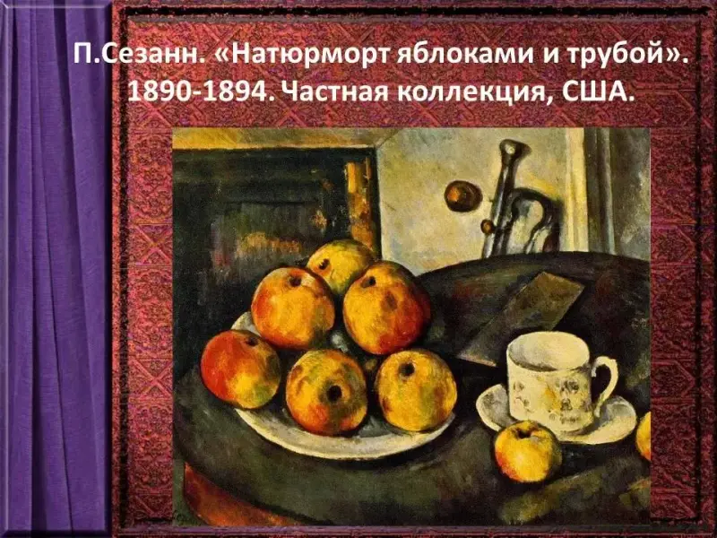 Предвосхищая новые тенденции в живописи конца XIX - начала XX века, обратимся к великому французскому постимпремссионисту П.Сезанну. Вот что он писал: «Все в природе лепится в форме шара, конуса, цилиндра; надо учиться писать на этих простых фигурах». То есть живопись для П.Сезана перестает быть просто копией реальности, она становится конструкцией. В полотне «Натюрморт с яблоками и трубой» П.Сезанн прибегает к деформации предметов, сознательно нарушает их симметрию. Яблоки наклонены, а на заднем плане возле камина мы видим клапан трубы.
