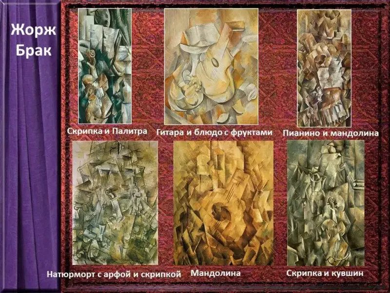 Работа Ж.Брака «Скрипка и Палитра» транслирует лишь намек на реальность, предмет деформирован, как и в предыдущем натюрморте, различные углы восприятия наложены друг на друга.