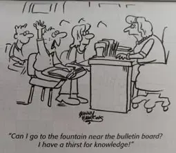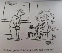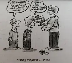 В качестве warming-up в начале урока можно показать учащимся карикатуры и попросить их объяснить значение тех или иных картинок и подписей к ним. На этих юмористических изображениях комический эффект создается не только преувеличением или заострением внимания на школьную тему, то еще и игрой слов, что позволит учащимся поближе познакомиться с тонким английским юмором (Рис. 1)Большинство учащихся не любят английскую грамматики, бояться ее изучать и находят ее скучной. Но, без освоения грамматики трудно продвигаться в изучении английского языка, потому что она помогает