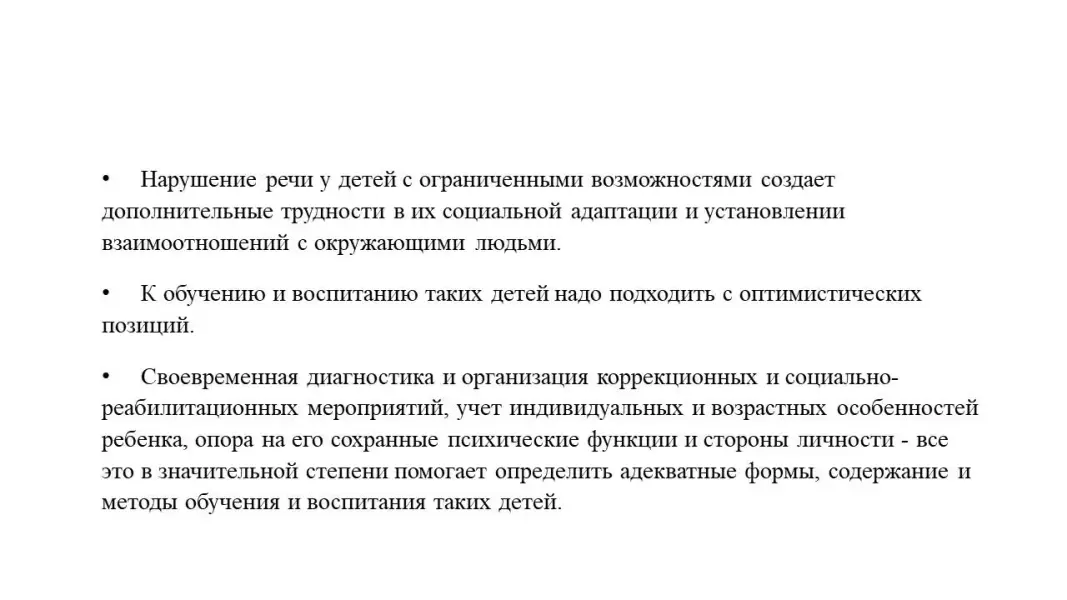 Нарушение речи у детей с ограниченными возможностями создает дополнительные трудности в их социальной адаптации и установлении взаимоотношений с окружающими людьми. Однако это не значит, что эти трудности непреодолимы и при создании необходимых условий и специально организованной коррекционной работе ребенок может догнать в развитии своих сверстников. Поэтому к обучению и воспитанию таких детей надо подходить с оптимистических позиций: верить в потенциальные возможности и способности ребенка преодолеть их.