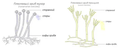 Плесневые грибы растут вертикально вверх и образуют на своих концах расширения в виде шариков, в которых образуются споры. Когда споры созреют, они оказываются в воздухе. Попав в благоприятные условия, спора прорастает и образуется грибница. Ученые относят плесень к простейшим грибковым паразитическим растениям, так как она не способна производить пищу для себя самостоятельно.