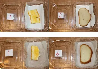 Хлеб и корочка апельсина в контейнерах №1 и №2 (на сухой салфетке) оставались без изменений.