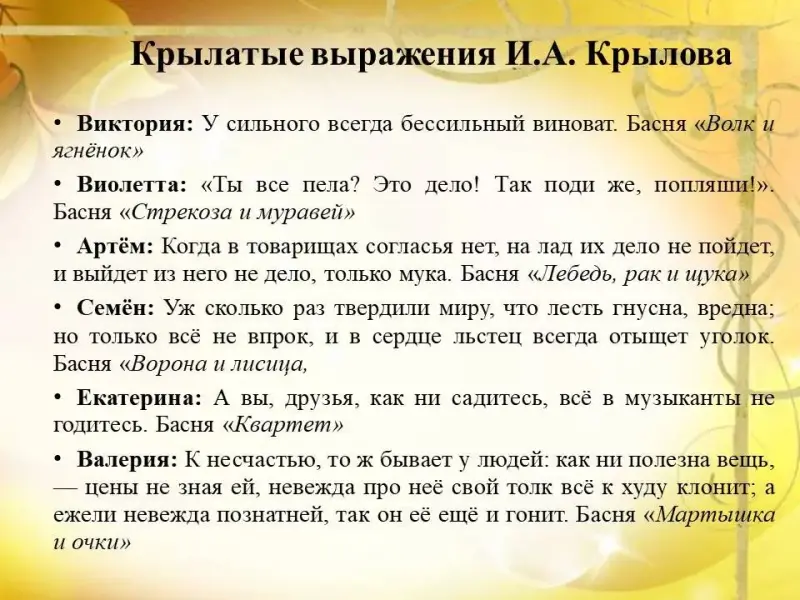 Раиса Ивановна: - Ребята, предлагаю вам прочитать афоризмы - это крылатые выражения из басен Крылова (дети считывают с экрана речевой материал, либо проговаривают с опорой на память) (Слайд №5)