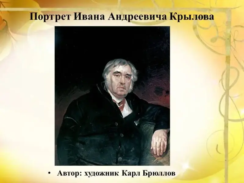 Мария Анатольевна: Художник Карл Брюллов, выполнил прекраснейший портрет баснописца И.А. Крылова. Как можно заметить, Крылов изображён в зрелом возрасте, об этом говорит его лицо,
