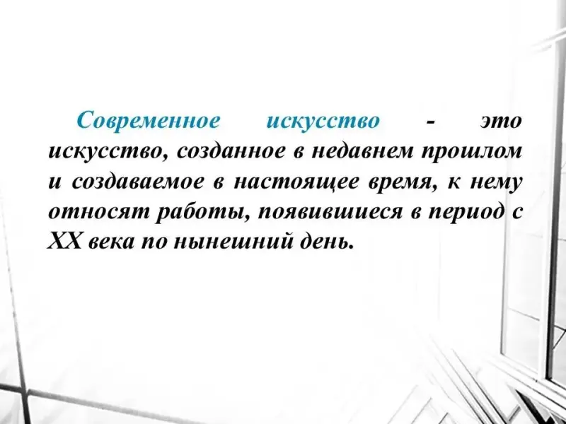Современное искусство - это искусство, созданное в недавнем прошлом и создаваемое в настоящее время, к нему относят работы, появившиеся в период с XX века по нынешний день.