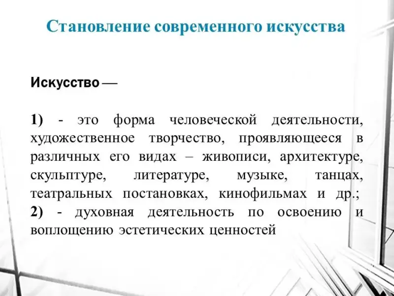 1) - это форма человеческой деятельности, художественное творчество, проявляющееся в различных его видах - живописи, архитектуре, скульптуре, литературе, музыке, танцах, театральных постановках, кинофильмах и др.;;