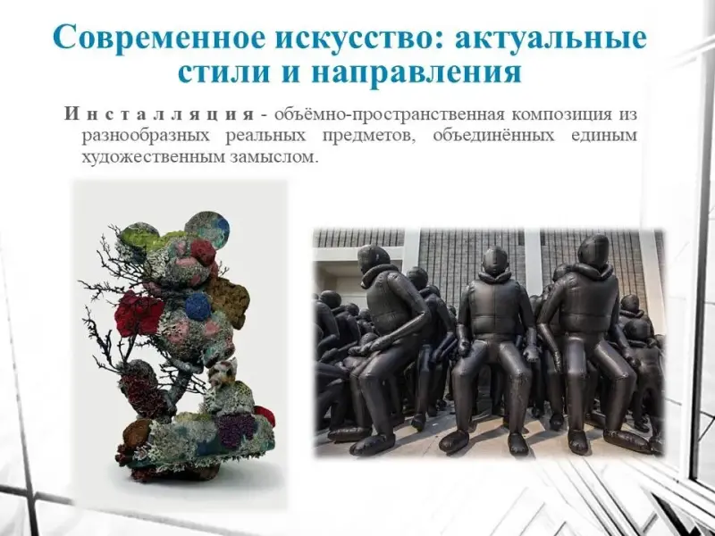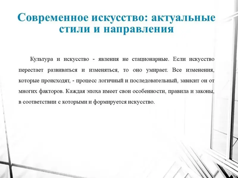 Современное искусство постоянно меняет свой облик. Наравне с уже существующими, так называемыми классическими течениями появляются новые, в которых преобладают другие образы, другая трактовка стандартных ситуаций и вопросов. В нашей исследовательской работе мы выявили наиболее актуальные стили и направления в современном искусстве.