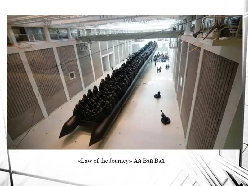 Главная его тема - глобальные проблемы миграции и отношение к мигрантам. В 2017 Вэйвэй представил в Праге инсталляцию Law of the Journey: 70-метровая надувная лодка с 258 надувными фигурами, обличает политику стран, игнорирующих тяжелое положение беженцев, плывущих к безопасным берегам (Приложение Б).