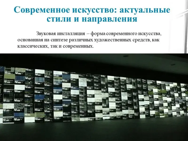 Современное искусство - это новая форма искусства концептуально, формально, технологически и психологически. Эти образы сложны для понимания, требуют определённой интеллектуальной подготовки и расшифровки в процессе восприятия.