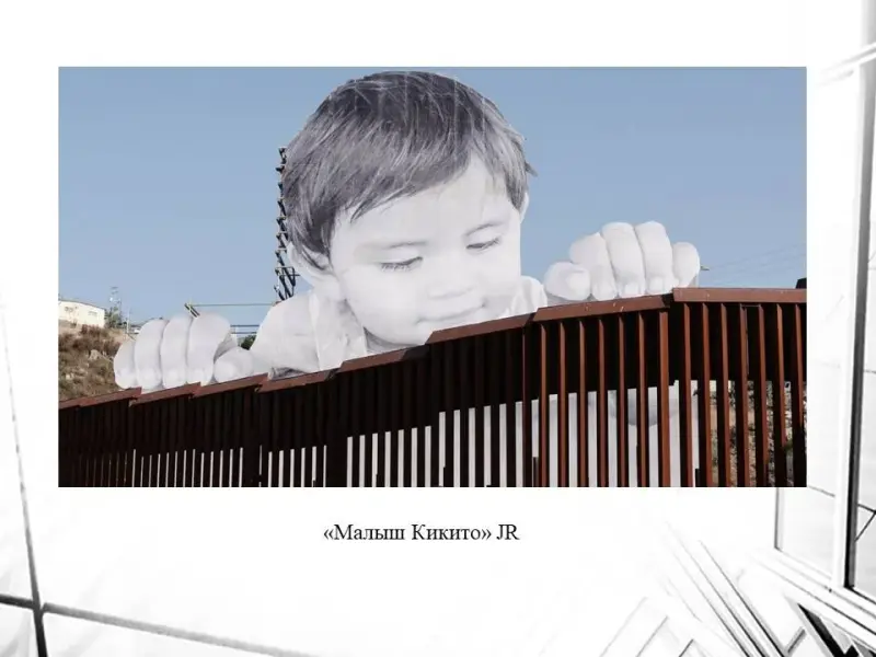 В сентябре 2017 огромный младенец появился на границе между Мексикой и Калифорнией. Малыш Кикито - плод воображения 34-летнего французского стрит-артиста JR. Кикито с любопытством заглядывает через пограничное ограждение, установленное в мексиканском городке Текате. Он появился там, благодаря поддержке местных жителей, сразу после указа Трампа, запрещающего легализацию несовершеннолетних перебежчиков. Среди самых известных проектов - «Женщины-герои» (2008) и «Морщины города» (2012) (Приложение Д).