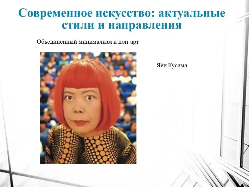 Яёи Кусама. Сегодня 88-летняя японская художница настоящая поп-звезда. На ее выставки в Америке, Европе и Азии выстраиваются огромные очереди. Во многом успех ее искусства, эффектно объединяющего минимализм и поп-арт, обеспечили социальные сети: инсталляции Кусамы, заряженные нереальным драйвом, давно стали самым модным фоном для селфи. Кусама не только любима широкой публикой, но и коммерчески успешна. Одна из ее работ продалась на аукционе Christie's примерно за 7 млн долларов. В 2017 Токио открылся ее музей. Пятиэтажный корпус возведен неподалеку от мастерской художницы и психиатрической лечебницы, в которой Кусама добровольно проживает с 1977 года. Кроме того, в 2017 году вышла книга для детей, посвященная работам Кусамы. А завершился год грандиозной выставкой художницы в Judd Fondation и двумя проектами в галерее David Zwirner - «Бесконечные зеркальные комнаты» и «Бесконечная сеть» (Приложение Ж). [10]