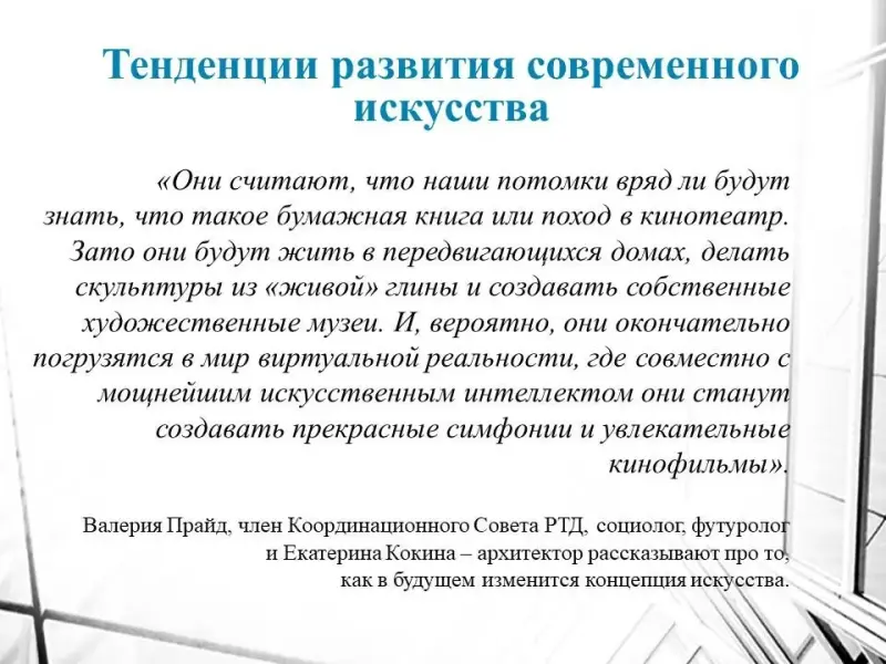 Валерия Прайд, член Координационного Совета РТД, социолог, футуролог и Екатерина Кокина - архитектор рассказывают про то, как в будущем изменится концепция искусства.