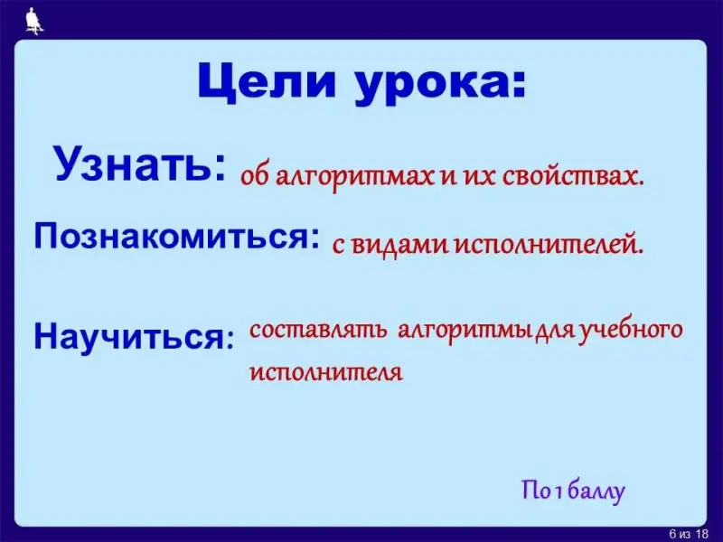 - предметные - формирование понимания смысла понятия «алгоритм»; умения анализировать предлагаемые последовательности команд на предмет наличия у них таких свойств алгоритма, как дискретность, определенность, понятность, результативность, массовость; понимания терминов «исполнитель», «формальный исполнитель», «среда исполнителя», «система команд исполнителя» и др.; умения исполнять алгоритм для формального исполнителя с заданной системой команд;