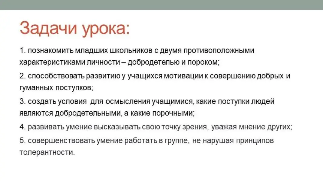 - Подвести учащихся к осознанию важности добродетели как характеристики личности, по которой его оценивают другие люди.