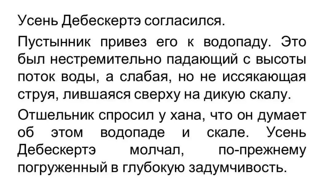 Отшельник спросил у хана, что он думает об этом водопаде и скале. Усень Дебескертэ молчал, по-прежнему погруженный в глубокую задумчивость.
