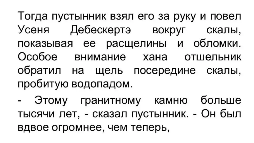 Тогда пустынник взял его за руку и повел Усеня Дебескертэ вокруг скалы, показывая ее расщелины и обломки. Особое внимание хана отшельник обратил на щель посередине скалы, пробитую водопадом.