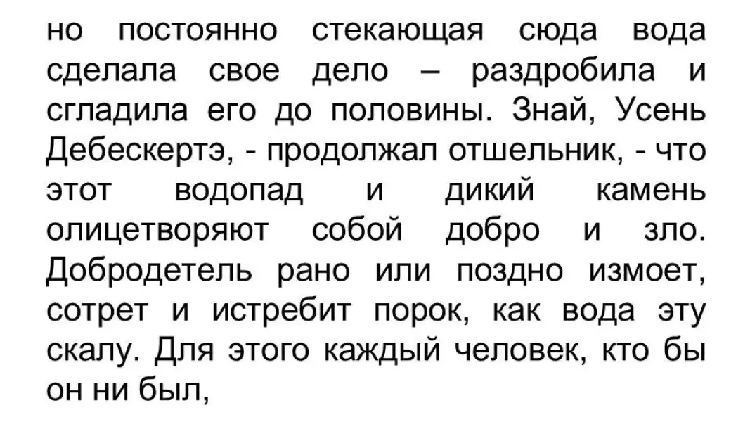 - Этому гранитному камню больше тысячи лет, - сказал пустынник. - Он был вдвое огромнее, чем теперь, но постоянно стекающая сюда вода сделала свое дело - раздробила и сгладила его до половины. Знай, Усень Дебескертэ, - продолжал отшельник, - что этот водопад и дикий камень олицетворяют собой добро и зло. Добродетель рано или поздно измоет, сотрет и истребит порок, как вода эту скалу. Для этого каждый человек, кто бы он ни был, по мере своих сил и возможности должен содействовать истреблению зла, то есть служить хотя бы каплей водопаду добродетели. Порок, благодаря слабости людей, живуч, но непременно настанет вечный день добродетели, и тогда тьма неправды исчезнет под лучами немеркнущего света истины! Возвращайся, хан, и будь спокоен.