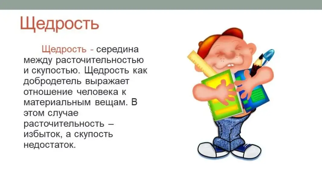 Щедрость - середина между расточительностью и скупостью. Щедрость как добродетель выражает отношение человека к материальным вещам. В этом случае расточительность - избыток, а скупость недостаток.