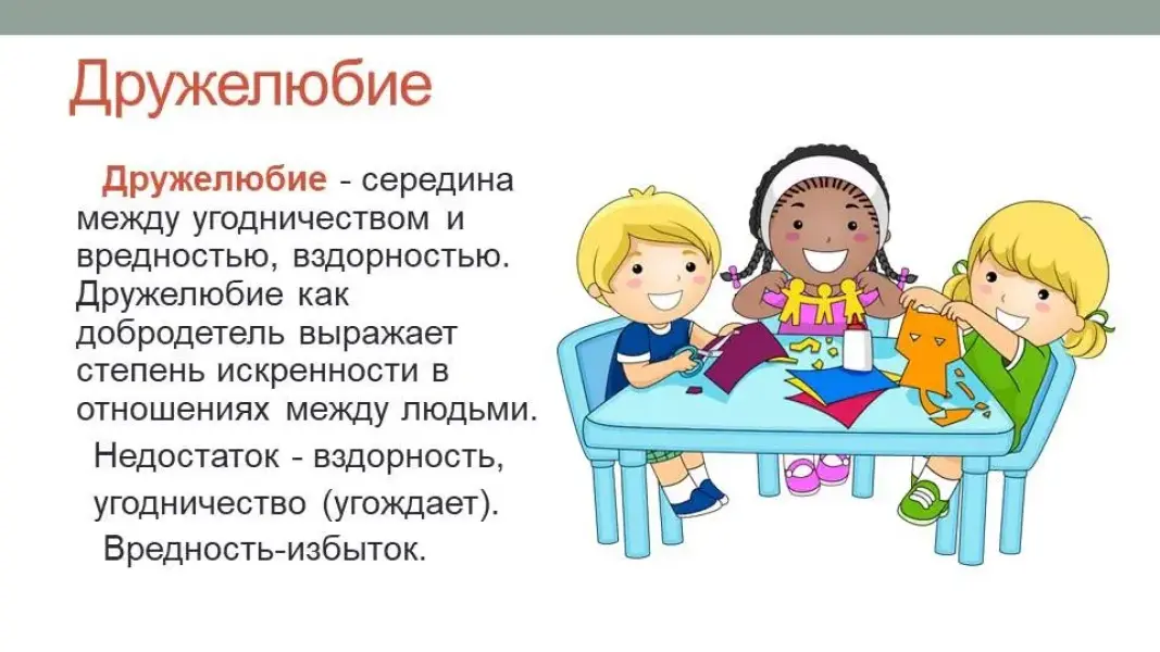 Дружелюбие - середина между угодничеством и вредностью, вздорностью. Дружелюбие как добродетель выражает степень искренности в отношениях между людьми.