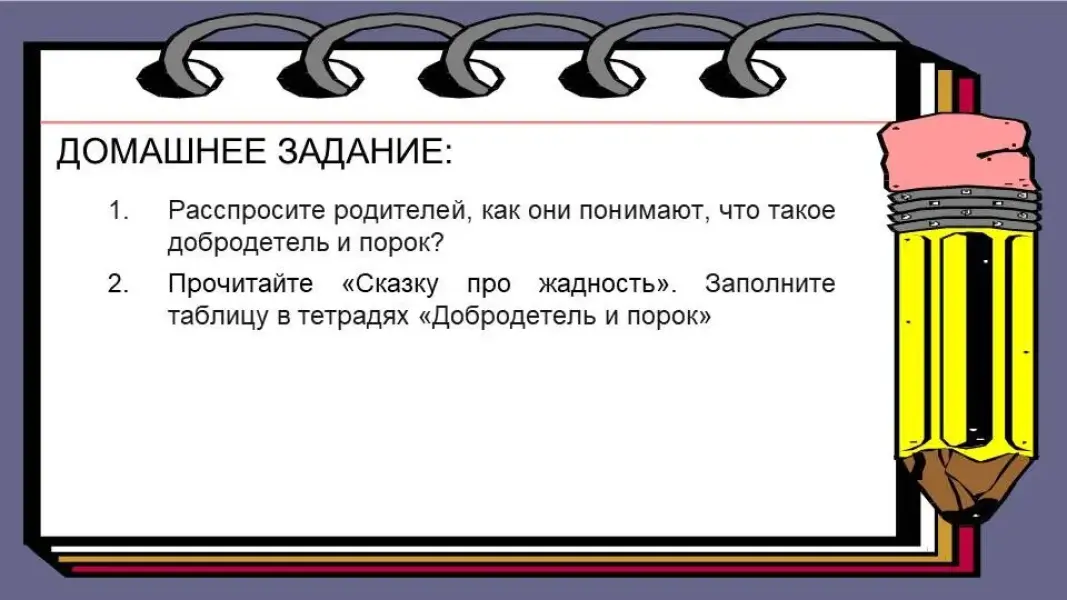 Прочитайте «Сказку про жадность». Заполните таблицу в тетрадях «Добродетель и порок».