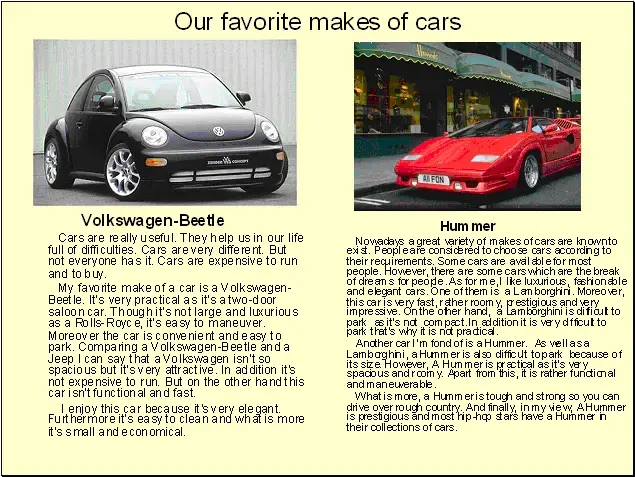 Наибольший интерес вызвало составление мини проекта по теме "Моя любимая марка автомобиля", где все учащиеся аргументированно обосновывали свой выбор. Пример мини проекта дан на рис. 9.