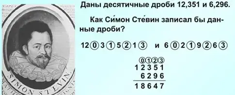 - А вот как выполнял сложение десятичных дробей фламандский инженер и ученый Симон Стевин.