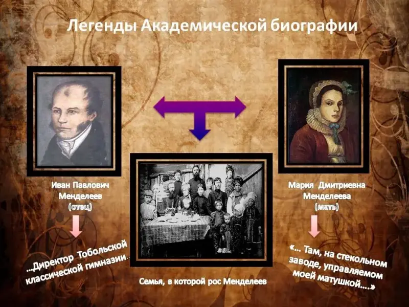 Дмитрий Менделеев был семнадцатым ребёнком в семье Ивана Павловича Менделеева, который занимал должность директора Тобольской гимназии и Марии Дмитриевны Менделеевой. На то время многодетная семья была нетипичной для русской интеллигенции. (Слайд 5)