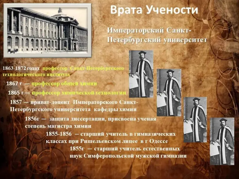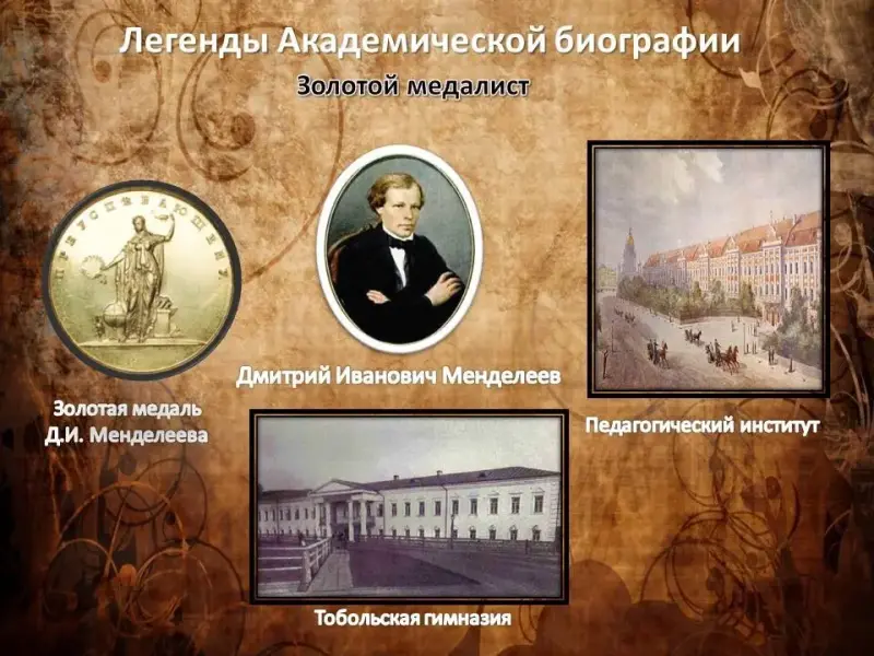 После окончания гимназии, Дмитрий Менделеев поступил в Главный педагогический институт Петербурга на отделение естественных наук физико-математического факультета, который окончил с золотой медалью. (Слайд 6)
