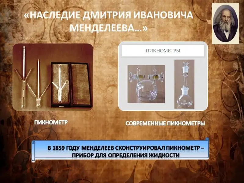 1859 году Менделеев сконструировал прибор для определения плотности жидкости - пикнометр. (Слайд 8)