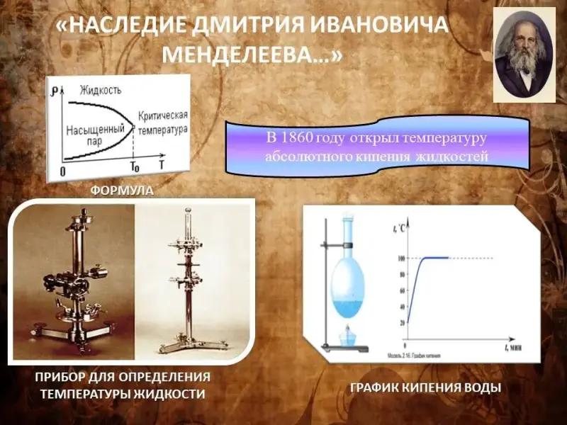 В 1860 году открыл критическую температуру кипения жидкостей, при которой плотность и давление насыщенного пара максимальны, а плотность жидкости, находящейся в динамическом равновесии с паром, минимальна. (Слайд 9)