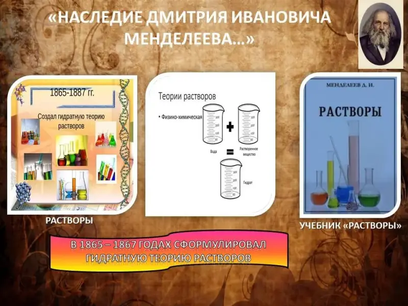 Дмитрий Иванович сформулировал гидратную теорию растворов. Основы учения Менделеева о растворах были заложены в 1865-м в его докторской диссертации.