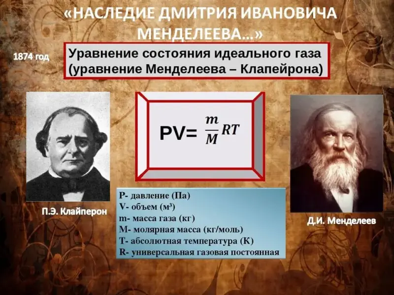 В 1874 году вывел общее уравнение состояния идеального газа (уравнение Клапейрона-Менделеева), а также начал исследовать свойства реальных газов. (Слайд 14)
