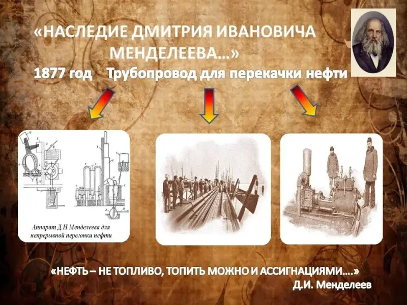 Менделеев первым заявил о том, что сжигать нефть в топках - преступление, поскольку из неё можно получить множество химических продуктов и придумал использовать трубопровод для перекачки нефти. (Слайд 16)