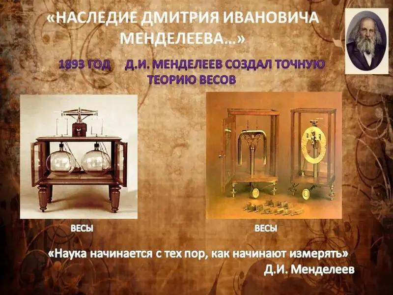 Дмитрий Иванович создал точную теорию весов, разработал наилучшие конструкции коромысла и арретира. На базе Депо образцовых гирь и весов в 1893 году создал Главную палату мер и весов. Способствовал узакониванию основных мер длины и веса (аршин и фунт). (Слайд 19)