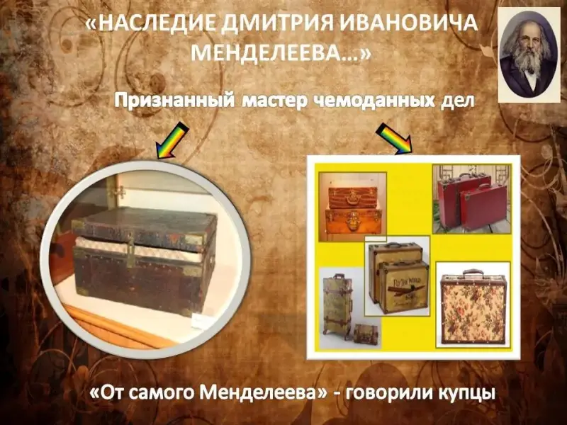 Дмитрий Иванович любил переплетать книги, клеить рамки для портретов, а также изготавливать чемоданы. В Петербурге и в Москве знали его как лучшего в России чемоданных дел мастера. «От самого Менделеева», - говорили купцы. Учёный изучил все известные в то время рецепты приготовления клея и придумал свою особую клеевую смесь. (Слайд 21)
