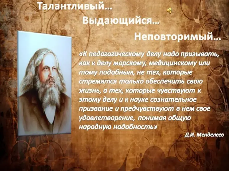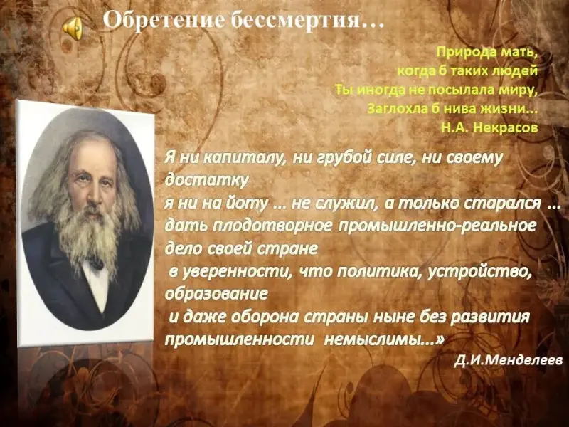 «Имя Д.И.Менделеева бессмертно. Личность его легендарна, а подвиг научный благодарное человечество не забудет никогда. Жизнь великого человека всегда достойна подражания... И пусть будет для нас примером, пусть вдохновляет нас во всех делах на благо родины и народа, во имя прогресса и мира на земле величественная фигура гениального учёного, творца главного закона современной химии, славного сына и гражданина земли русской, нашего соотечественника Дмитрия Ивановича Менделеева.